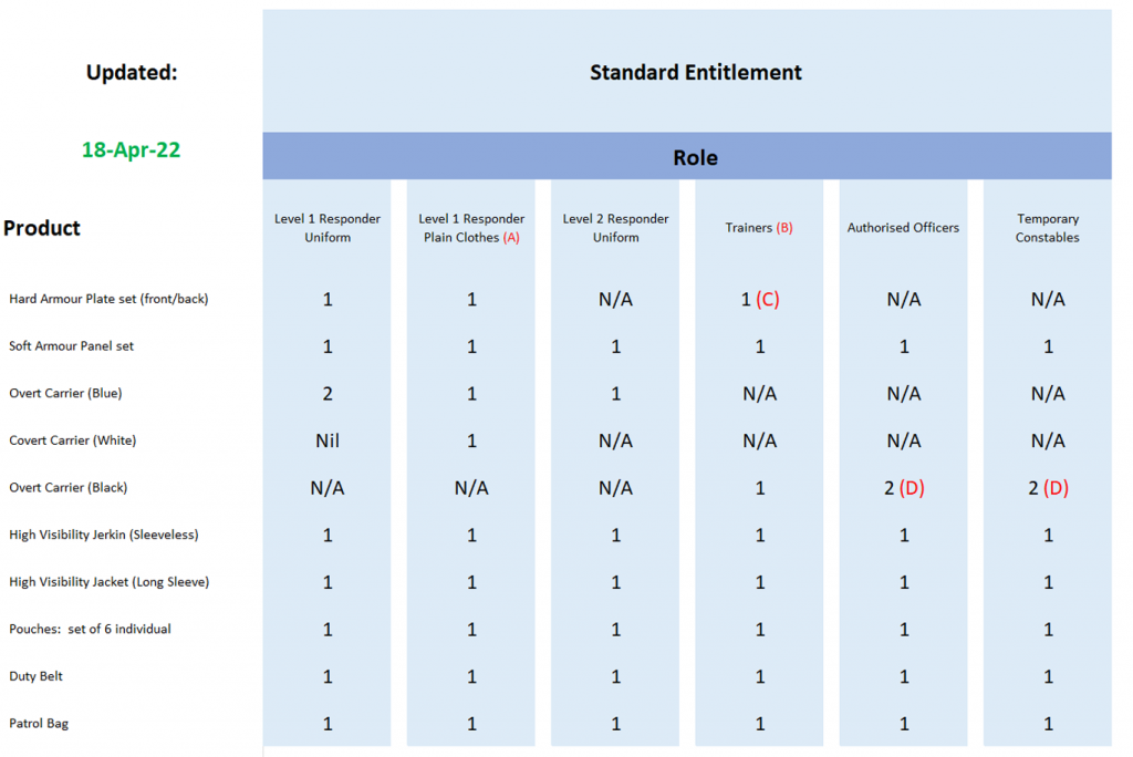 3. Selected Level 1 Responders – PNT: will receive a Supplementary Entitlement over and above their Standard Entitlement. PNT L1 Supplementary Kit consists: One set of HAP, one set of soft armour, one overt carrier, one duty belt, one set of pouches, one patrol bag. They will also receive one covert carrier. |