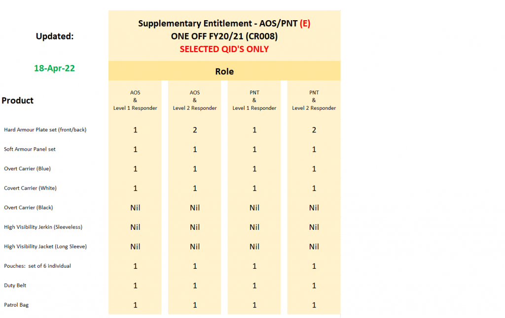 4. Selected Level 2 Responders – PNT: will receive a Supplementary Entitlement over and above their Standard Entitlement. AOS L2 Supplementary Kit consists: One set of HAP (to upgrade their current L2 BAS to meet L1 threshhold). In addition, they are to receive One set of HAP, one set of soft armour, one overt carrier, one duty belt, one set of pouches, one patrol bag. They will also receive one covert carrier. |